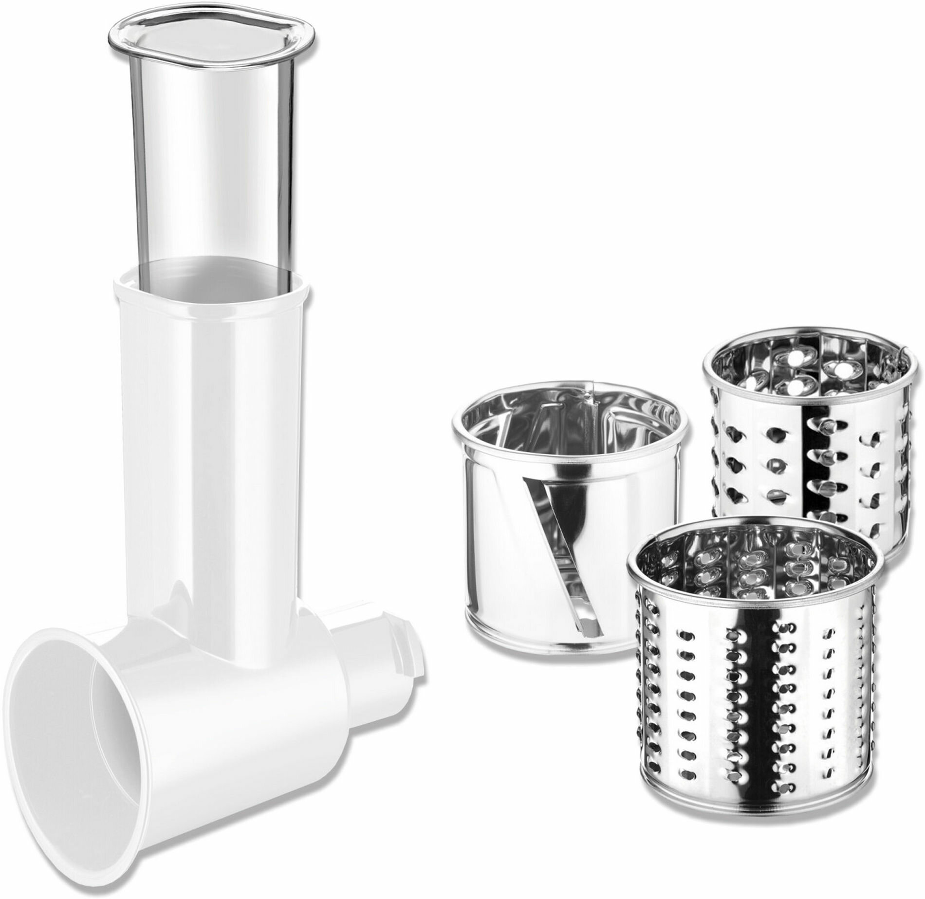tarczki i przystawki do krojenia – wykonane z hartowanej stali nierdzewnej, umożliwiające szatkowanie, tarcie i krojenie warzyw oraz owoców na różne grubości,