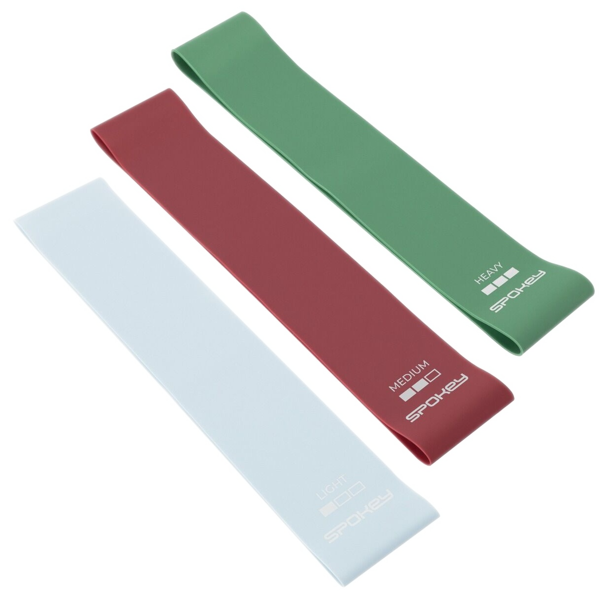 3 poziomy oporu – od lekkiego (2–4 kg) po intensywny (8–12 kg), Wymiary: Light: 50 × 5 × 0,04 cm (2–4 kg), Medium: 50 × 5 × 0,08 cm (5–7 kg), Heavy: 50 × 5 × 0,12 cm (8–12 kg), Przeznaczenie: rozgrzewka, trening siłowy, mobilność, aerobik, rehabilitacja