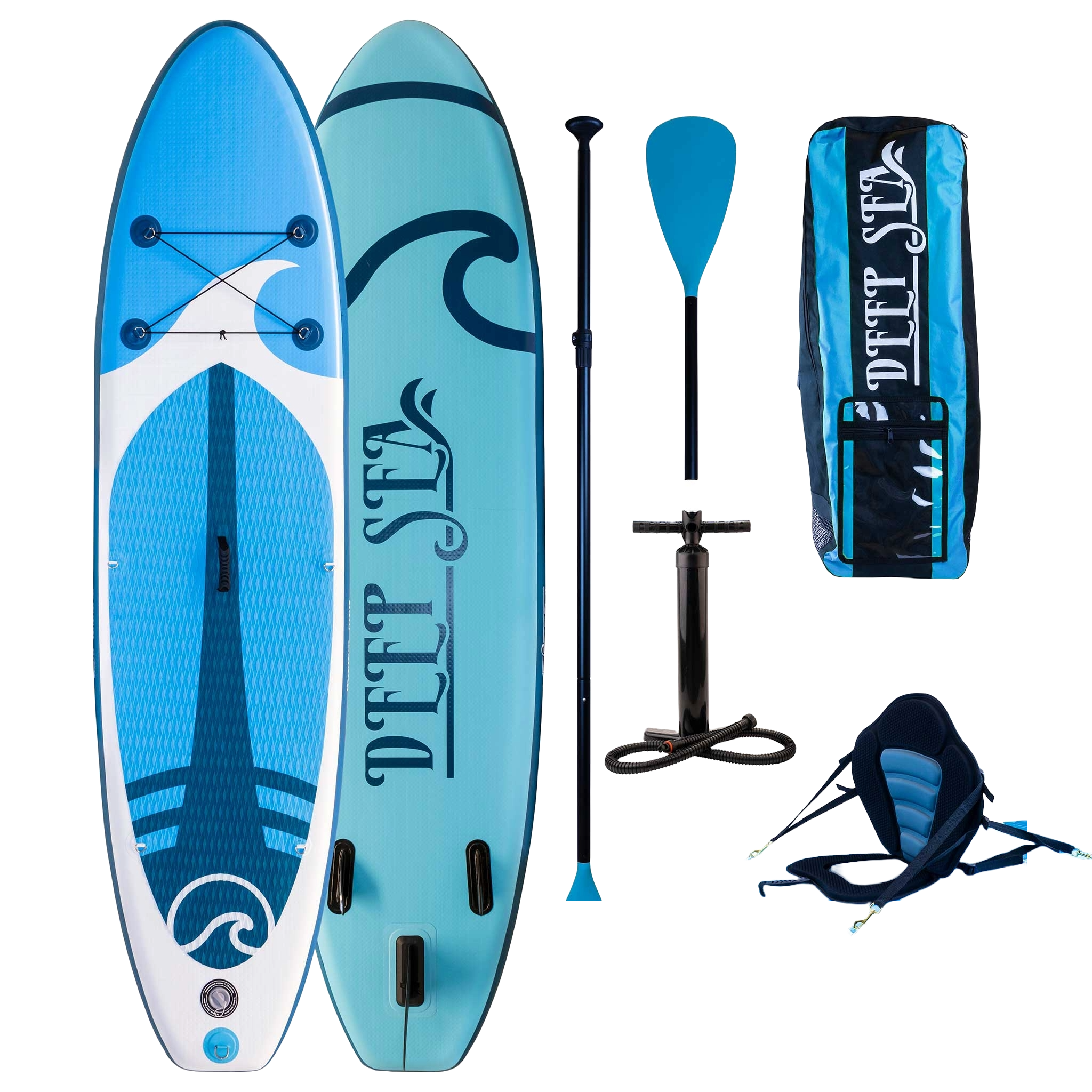 Deska SUP, siedzisko, wiosło, pompka, fin, smycz, plecak transportowy, torba wodoszczelna, wodoszczelne etui na telefon, pasek na ramię, zestaw naprawczy