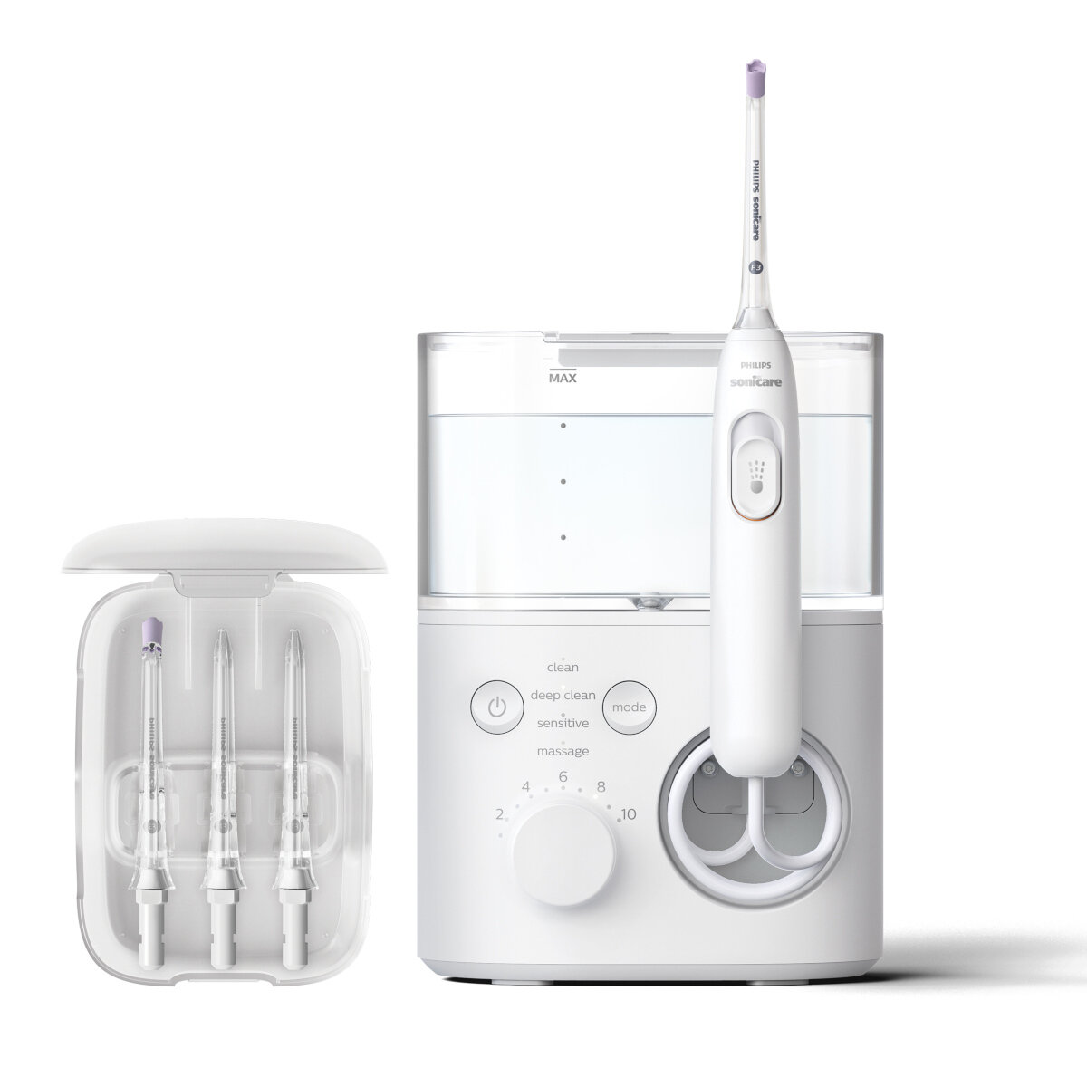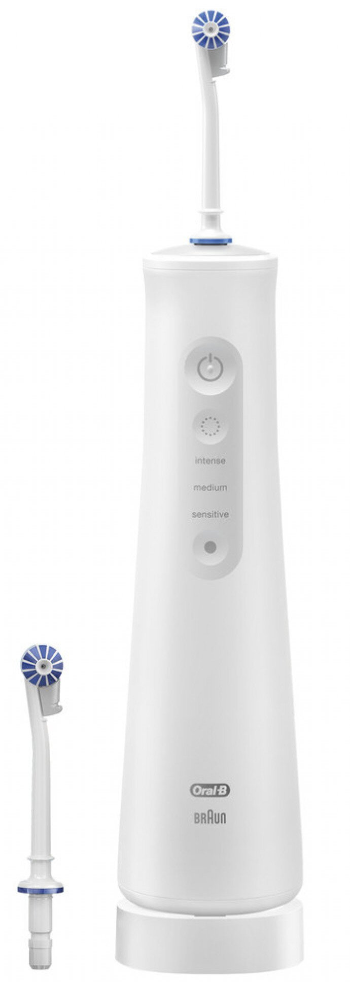 • wymienne końcówki – umożliwiające dopasowanie strumienia wody do różnych potrzeb użytkownika (np. końcówki ortodontyczne, do czyszczenia języka, standardowe),