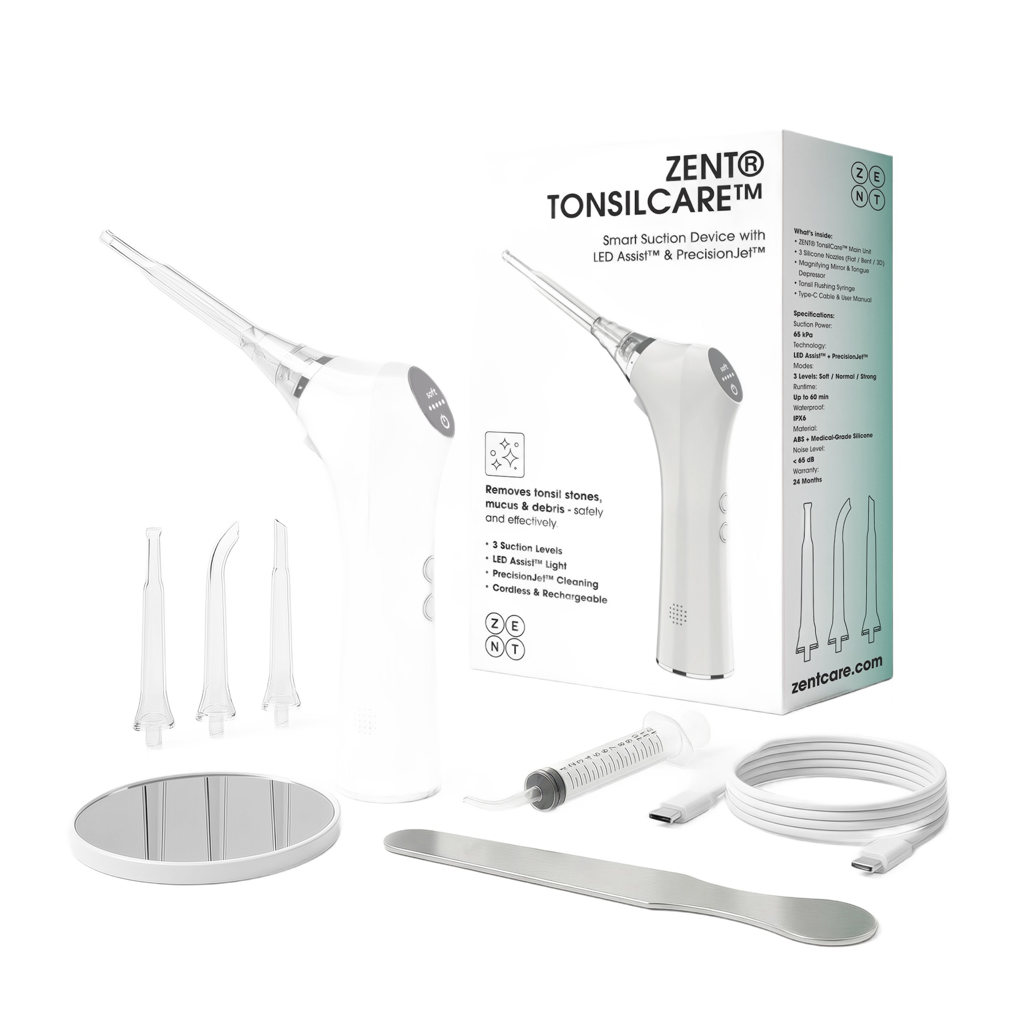 urządzenie ZENT® TonsilCare™, 3 silikonowe końcówki, kabel USB-C, instrukcja obsługi