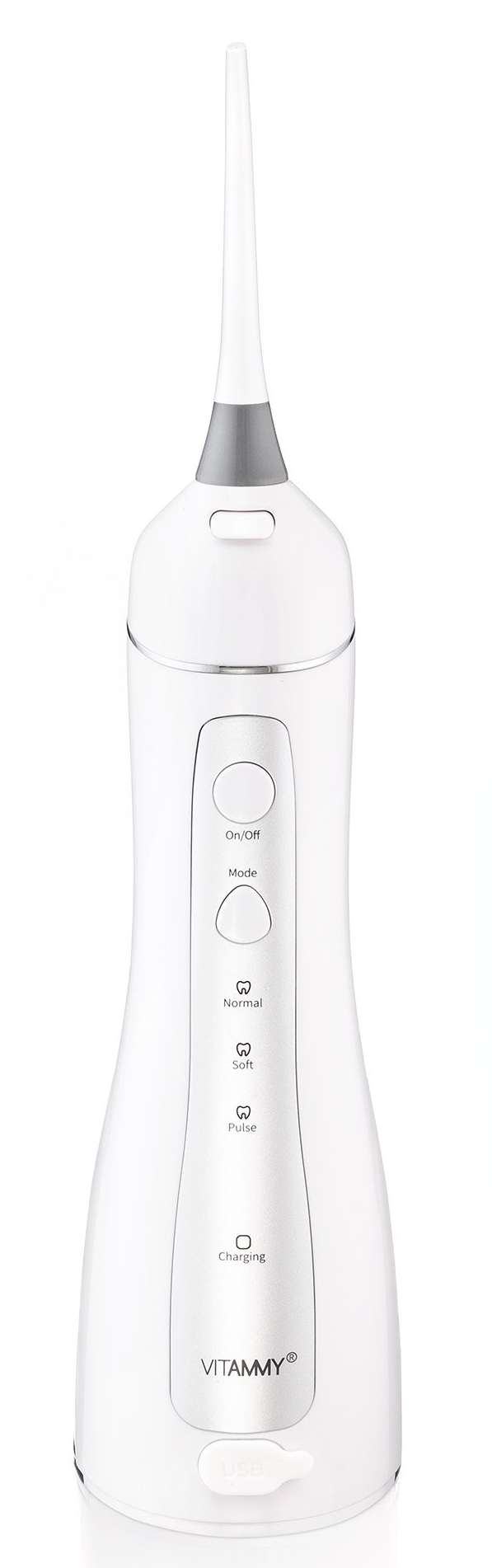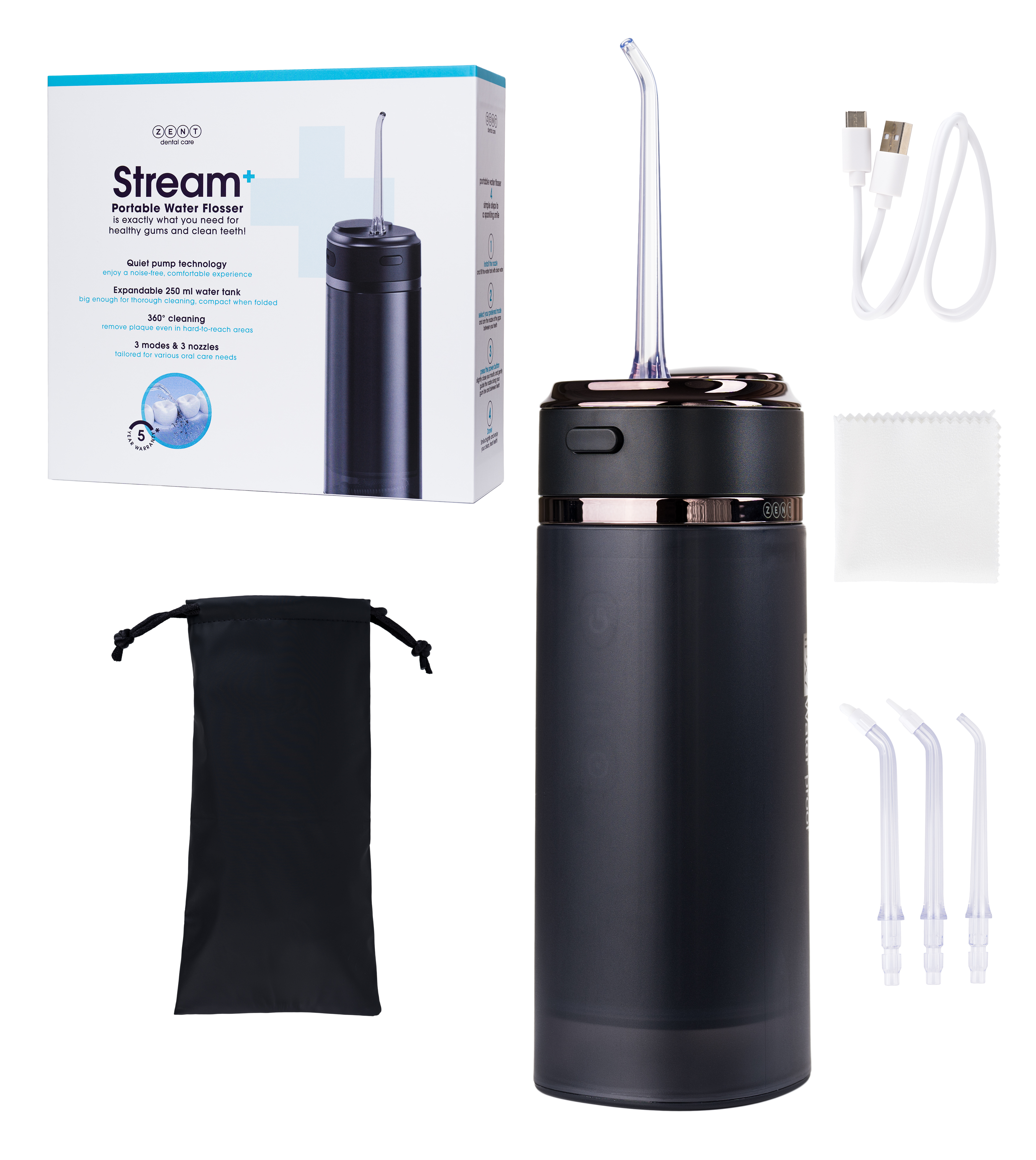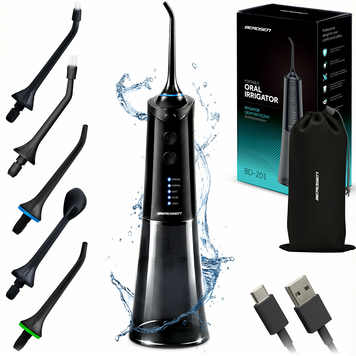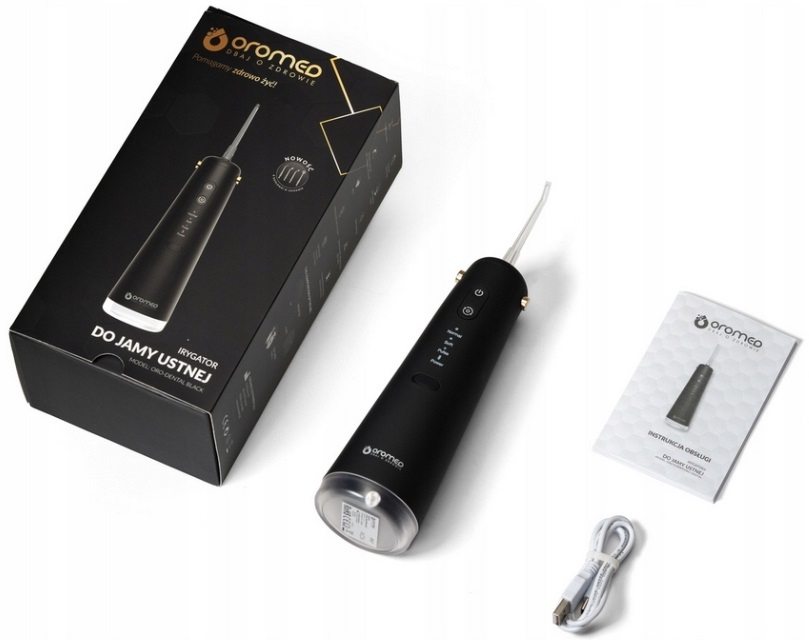 wymienne końcówki – umożliwiające dopasowanie strumienia wody do różnych potrzeb użytkownika (np. końcówki ortodontyczne, do czyszczenia języka, standardowe),