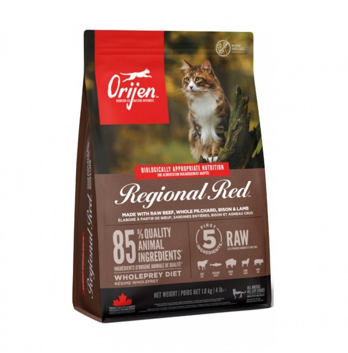 Białko surowe 33%, Tłuszcz surowy 22%, Popiół surowy 7,5%, Włókna surowe 1,6%, Tauryna 1900 mg/kg, Metaboliczna energia: 4292 kcal/kg