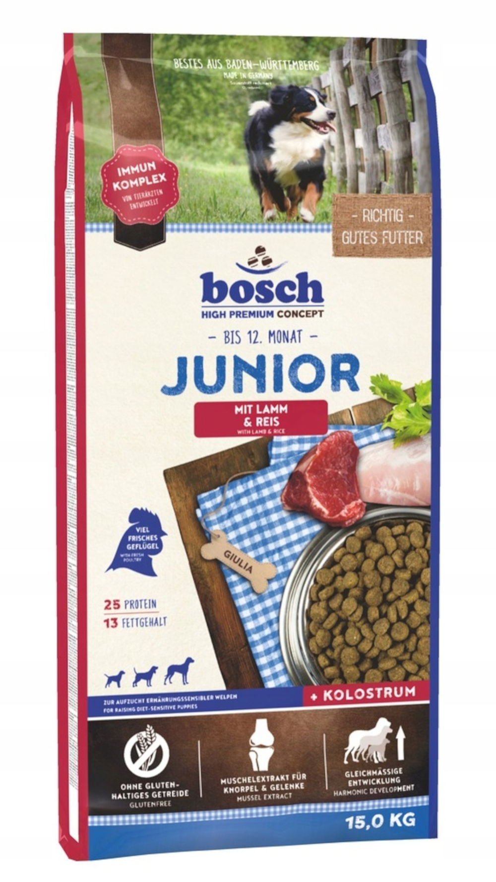 Białko surowe: 32%, tłuszcz surowy: 21%, włókno surowe: 4%, popiół surowy: 9,5%, wilgotność: 9%, wapń (Ca): 2,1%, fosfor (P): 1,1%, kwasy tłuszczowe Omega-3: 1,9%.