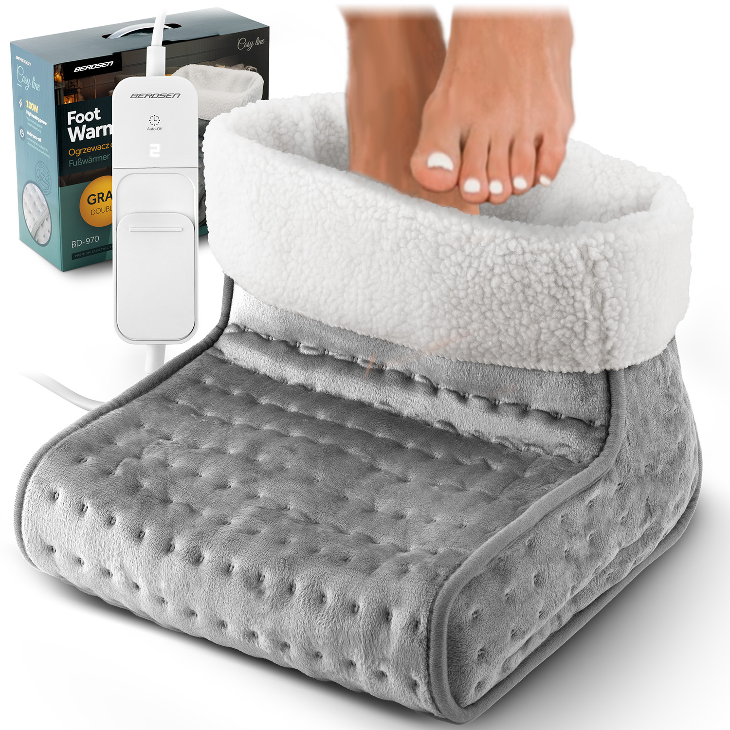 Ogrzewacz do stóp, wewnętrzny futerkowy wkład, przewód z pilotem sterującym, instrukcja użytkowania.