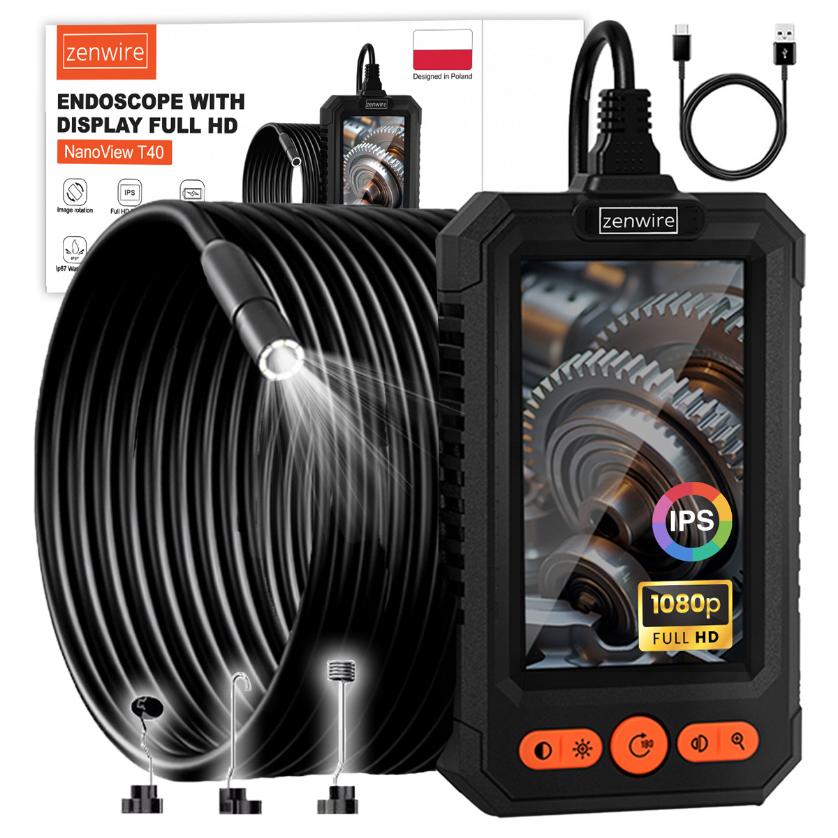 Endoskop Zenwire NanoView T40 z przewodem 5 m, kabel USB-C do ładowania, końcówki: haczyk, lusterko boczne, magnes, instrukcja obsługi PL/EN, opakowanie