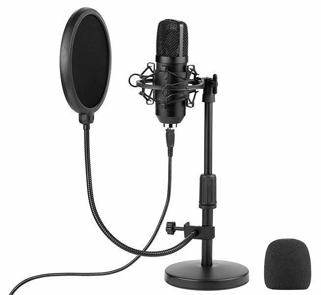 Mikrofon, statyw, pop-filtr, przewód USB, skrócona instrukcja obsługi