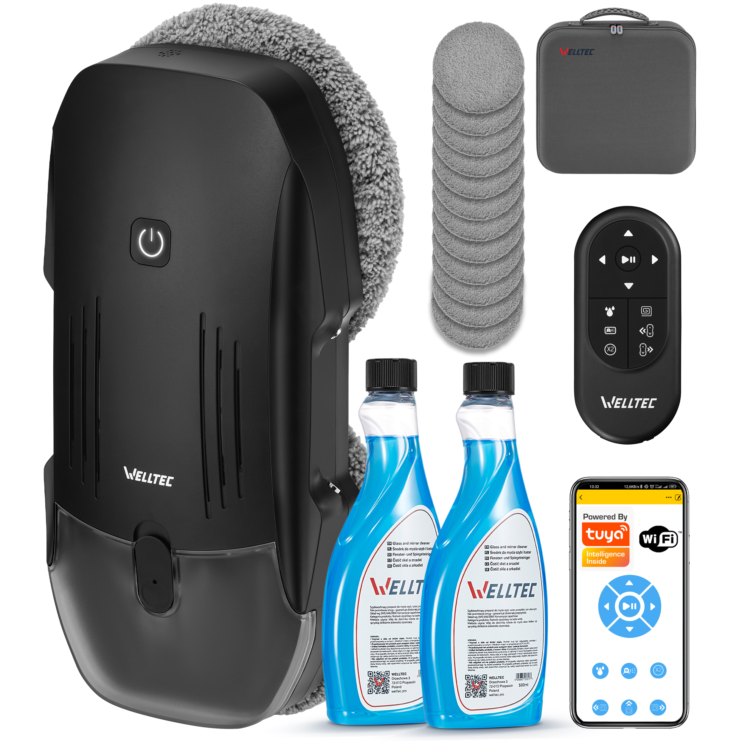 Robot do mycia okien 14x Ściereczka z mikrowłókien 4x Obręcz czyszcząca 1x Pilot sterujący z bateriami typu AAA 1x Zasilacz 1x Przewód zasilający AC (2,3m) 1x Przedłużacz zasilający DC (4m) 1x Buteleczka do dozowania płynu 1x Linka zabezpieczająca 1x Instrukcja obsługi