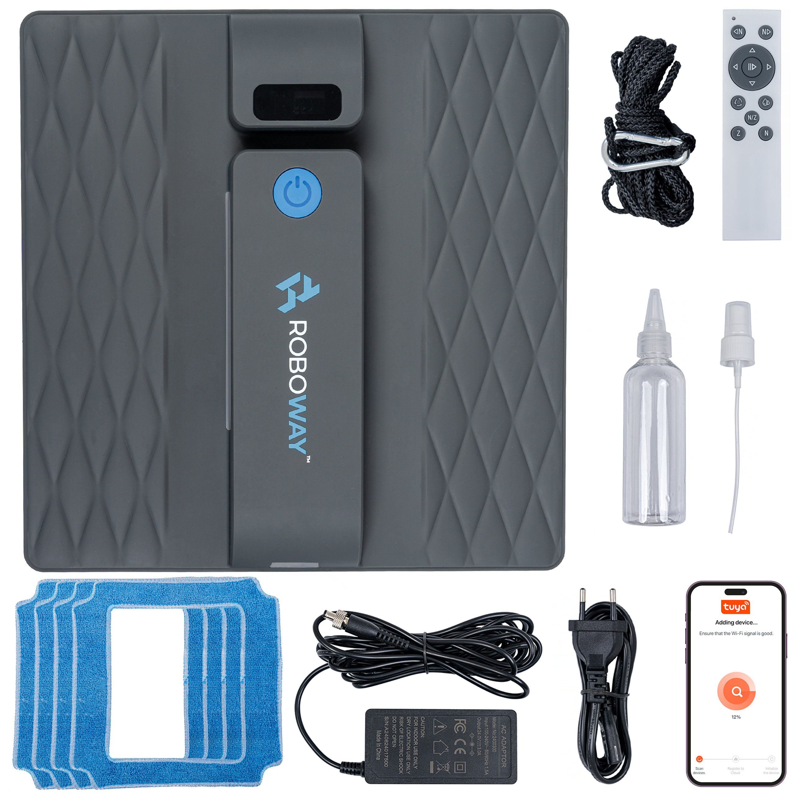 1x Roboty do czyszczenia okien,1x Zasilacz sieciowy,1x Podkładni czyszczace,1x W zestawie pilot zdalnego sterowania,1x Przewód zasilający dołączony