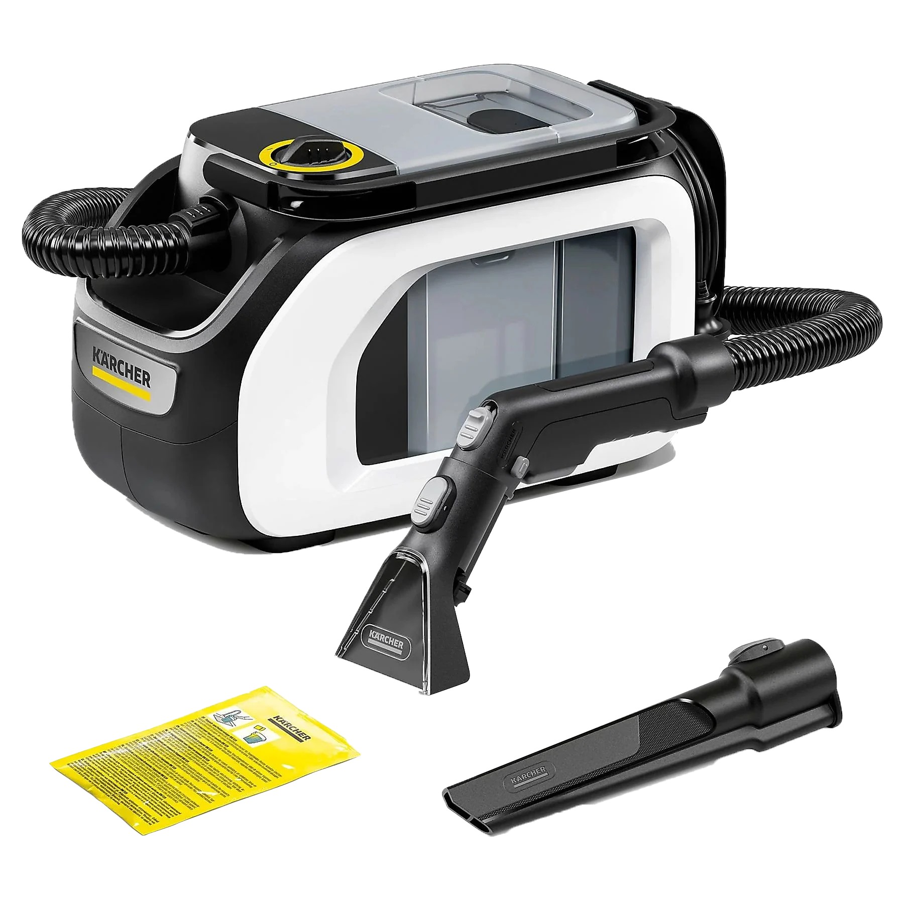 Odkurzacz piorący, szczotka 8cm, szczotka 15cm, szczotka szczelinowa, szczotka do obuwia, akcesorium do automatycznego czyszczenia, detergent 250ml do czyszczenia tapicerki i dywanów z plam i zabrudzeń po zwierzętach domowych, skrócona instrukcja obsługi