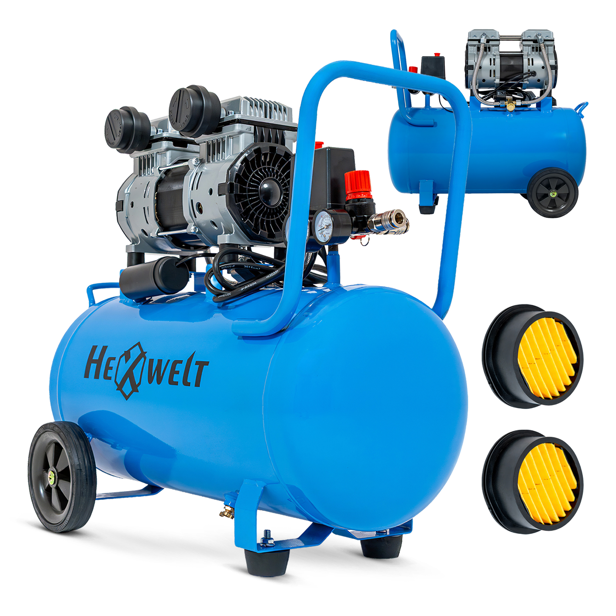 1x Kompresor bezolejowy 50L HEXWELT 1x Instrukcja obsługi 2x Koła transportowe 2x Gumy amortyzujące 4x Śruby montażowe 2x Podkładki 2x Zabezpieczenia do kół 2x Filtry powietrza z obudową