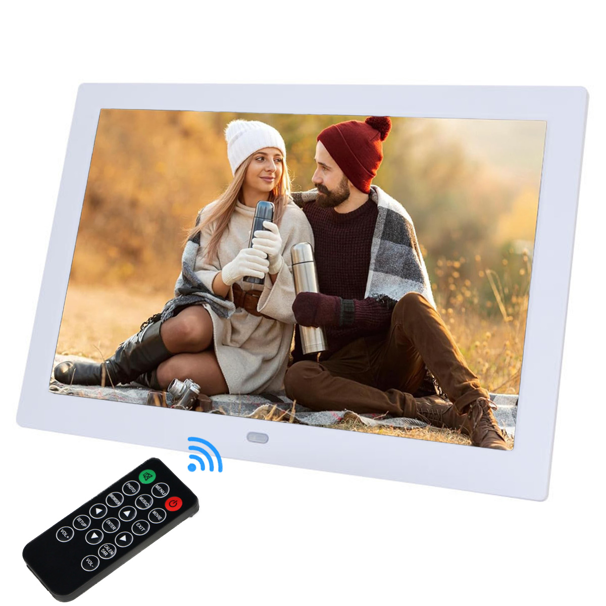 10,1-calowa cyfrowa ramka na zdjęcia z ekranem IPS 1280 x 800, elektroniczna ramka na zdjęcia, odtwarzacz wideo w pętli, elektroniczny album fotograficzny LED, nośnik reklamowy, kalendarz/zegar/muzyka/zdjęcia/odtwarzacz wideo z pilotem na podczerwień, obsługa USB/karty SD/USB/3,5 mm gniazdo słuchawkowe