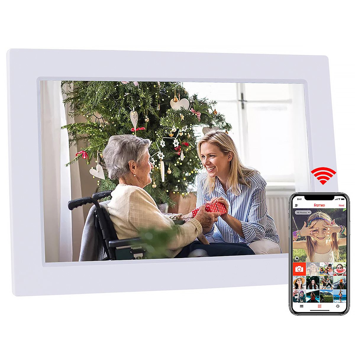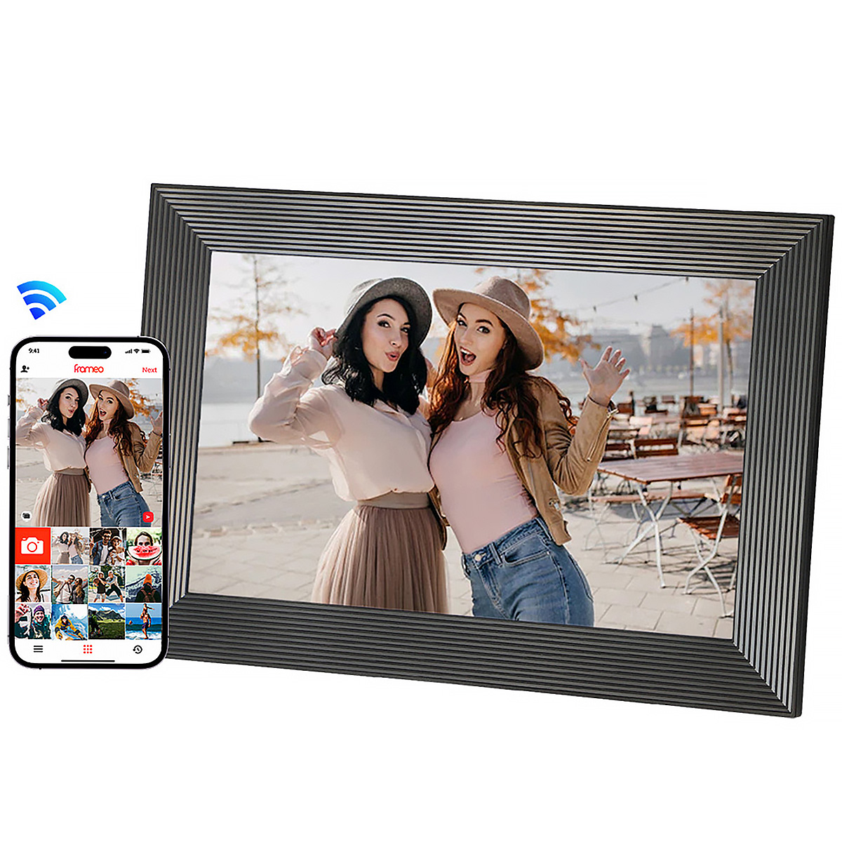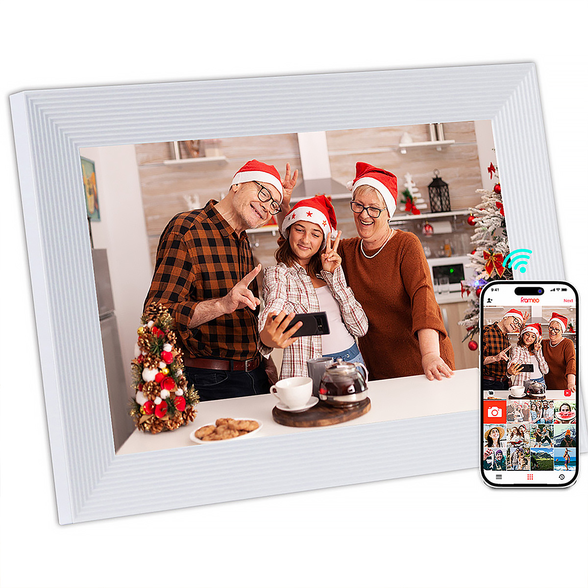 Frameo WiFi cyfrowa ramka na zdjęcia -10,1-calowa ramka na zdjęcia 1280x800 HD z ekranem dotykowym IPS, 16 GB pamięci, kalendarz/zegar/odtwarzacz muzyki/foto/wideo, obsługa USB/karty SD/USB/3,5 mm gniazdo słuchawkowe, automatyczne obracanie, montaż ścienny, natychmiastowe udostępnianie zdjęć/wideo, najlepszy wybór na prezent