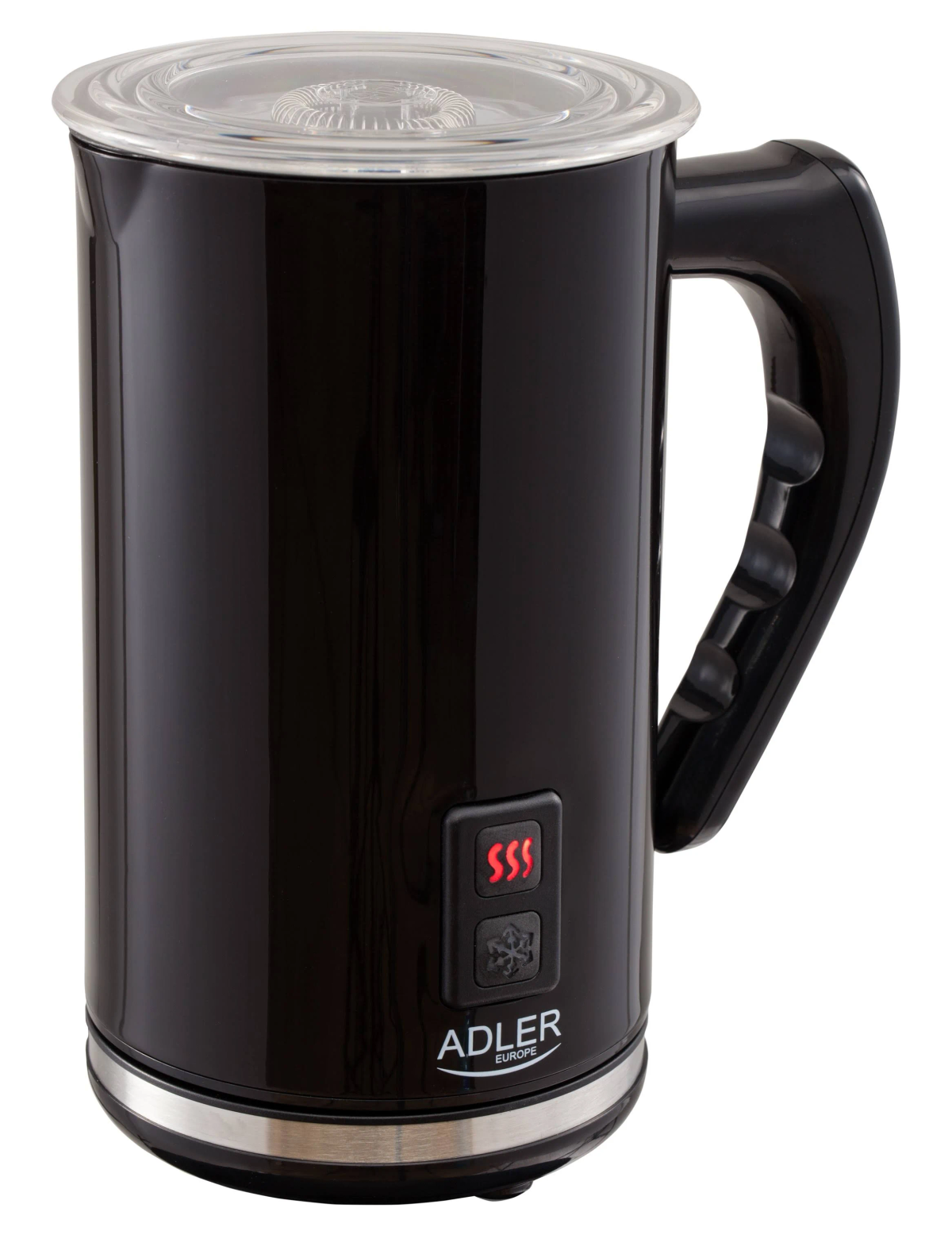 Spieniacz do mleka, obrotowa podstawa, przezroczysta pokrywka, mieszadło, instrukcja obsługi.