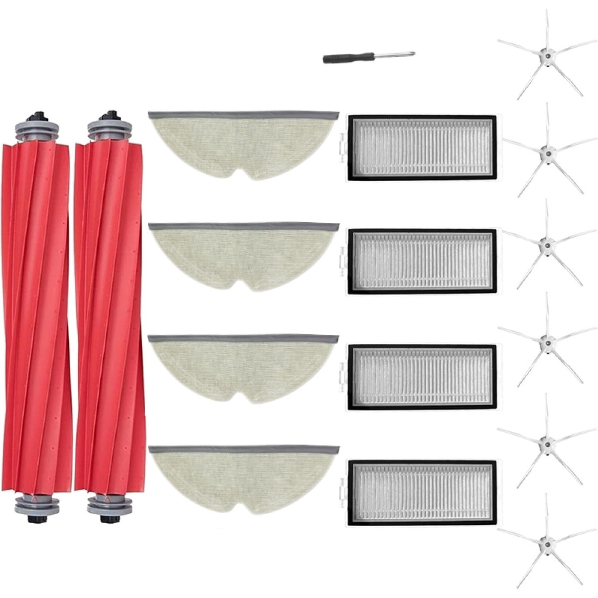 Główna szczotka x 2 Szczotka boczna x 6 Filtr x 4 Ściereczka do mopa x 4 Śrubokręt x 1 Szczotka do czyszczenia x 1