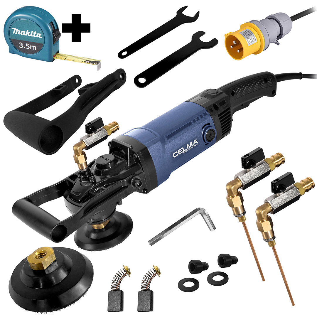 Szczotki zapasowe 1 kpl., klucz imbusowy 1 szt., dodatkowy uchwyt, 2x kranik do podłączenia wody, klucz płaski 2 szt., dysk elastyczny, podkładka, śruby montażowe