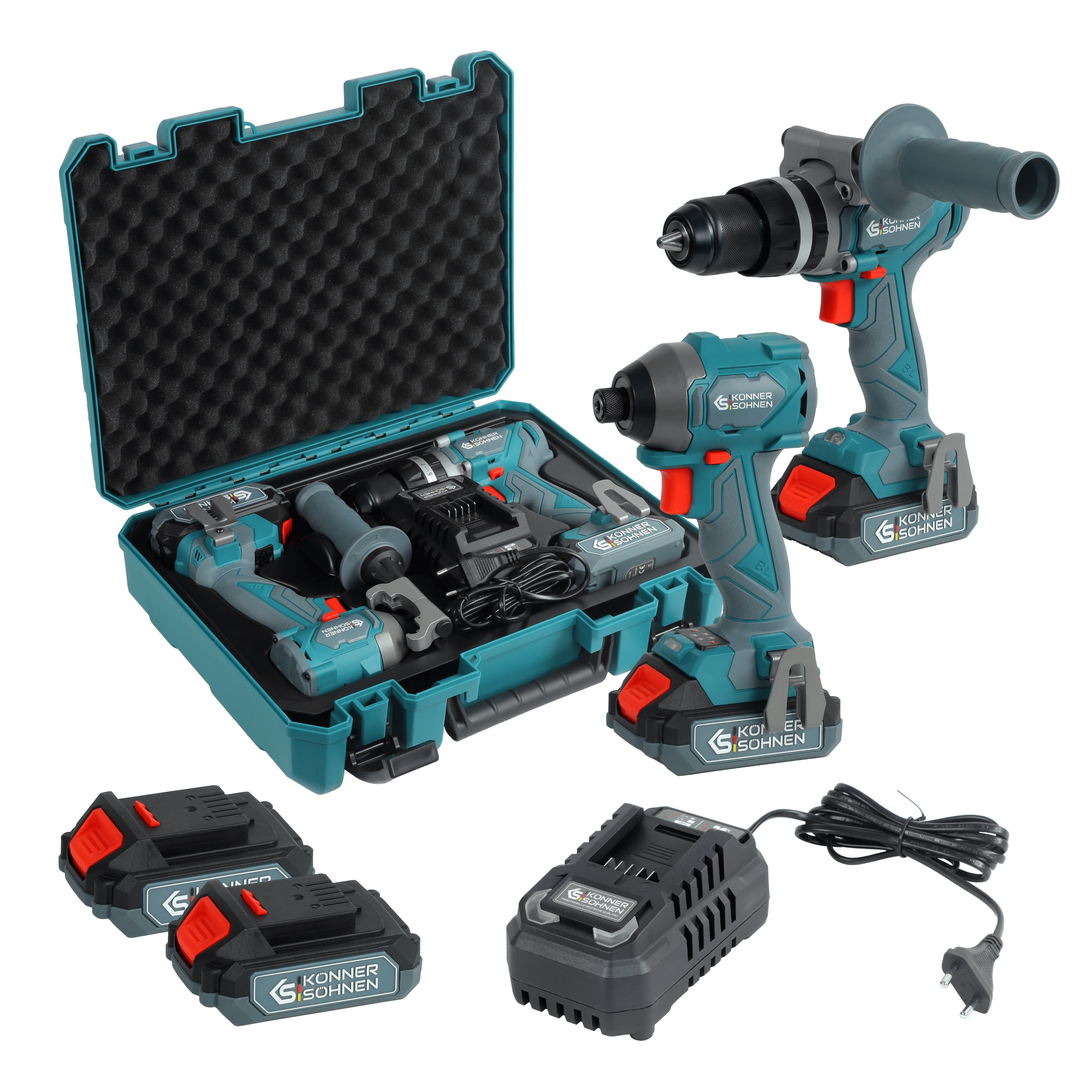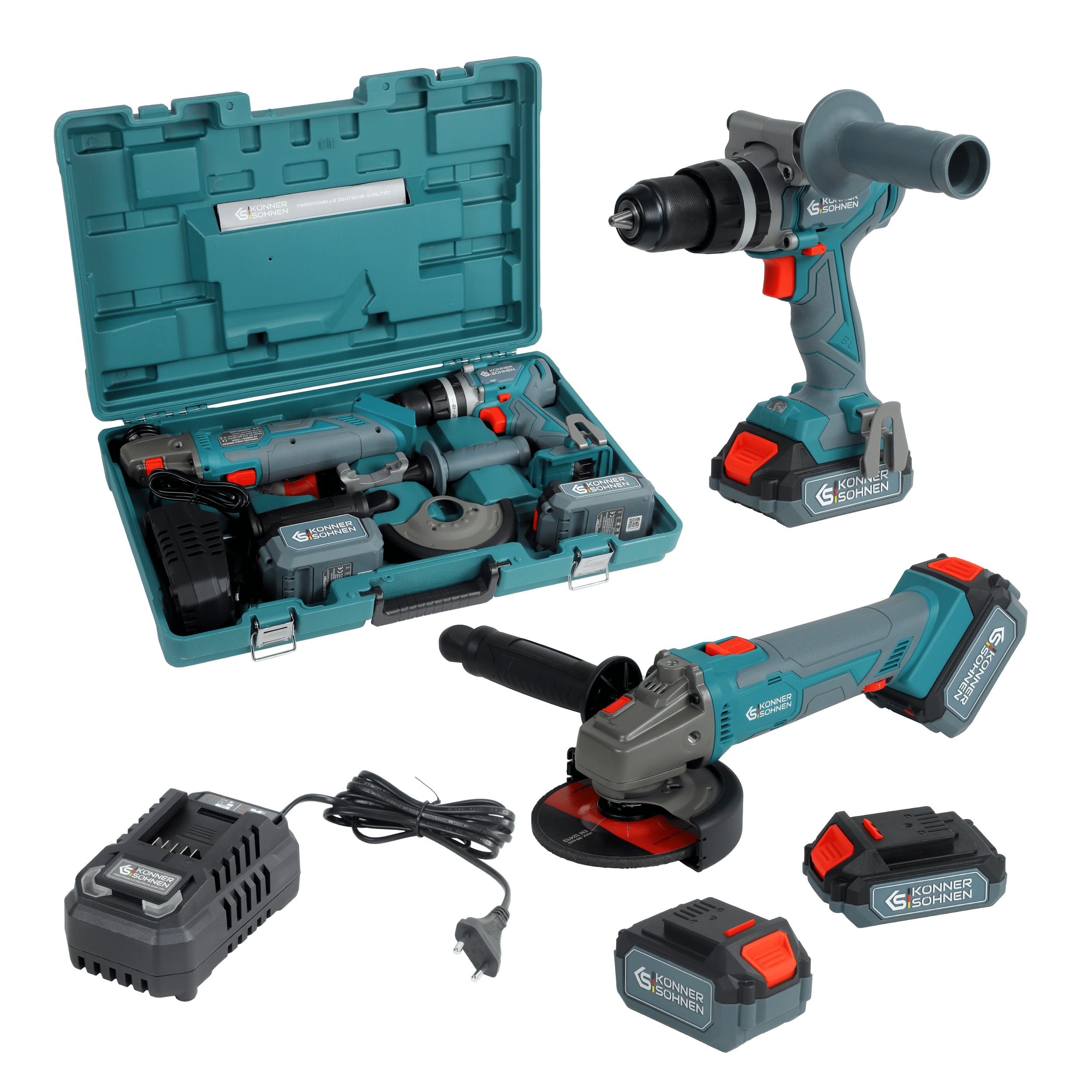 Wiertarko-wkrętarka akumulatorowa KS D20V-60, Szlifierka kątowa akumulatorowa KS AG20V-125VR, Młotowiertarka akumulatorowa KS RH20V-22-4, Ładowarka akumulatorowa 20V KS C45A, 3× Akumulator litowy 20V 4Ah, Dodatkowy samozaciskowy uchwyt wiertarski, Instrukcja