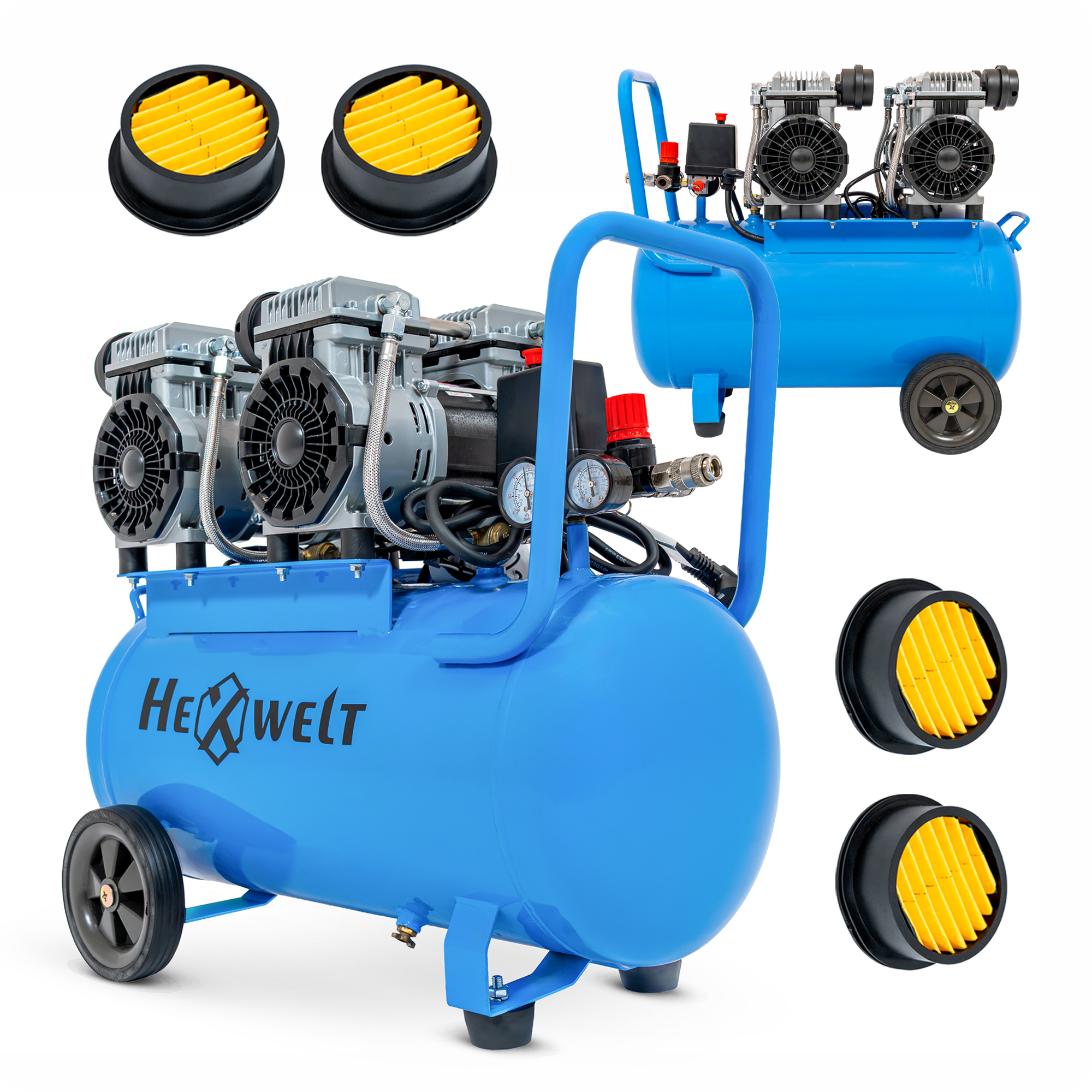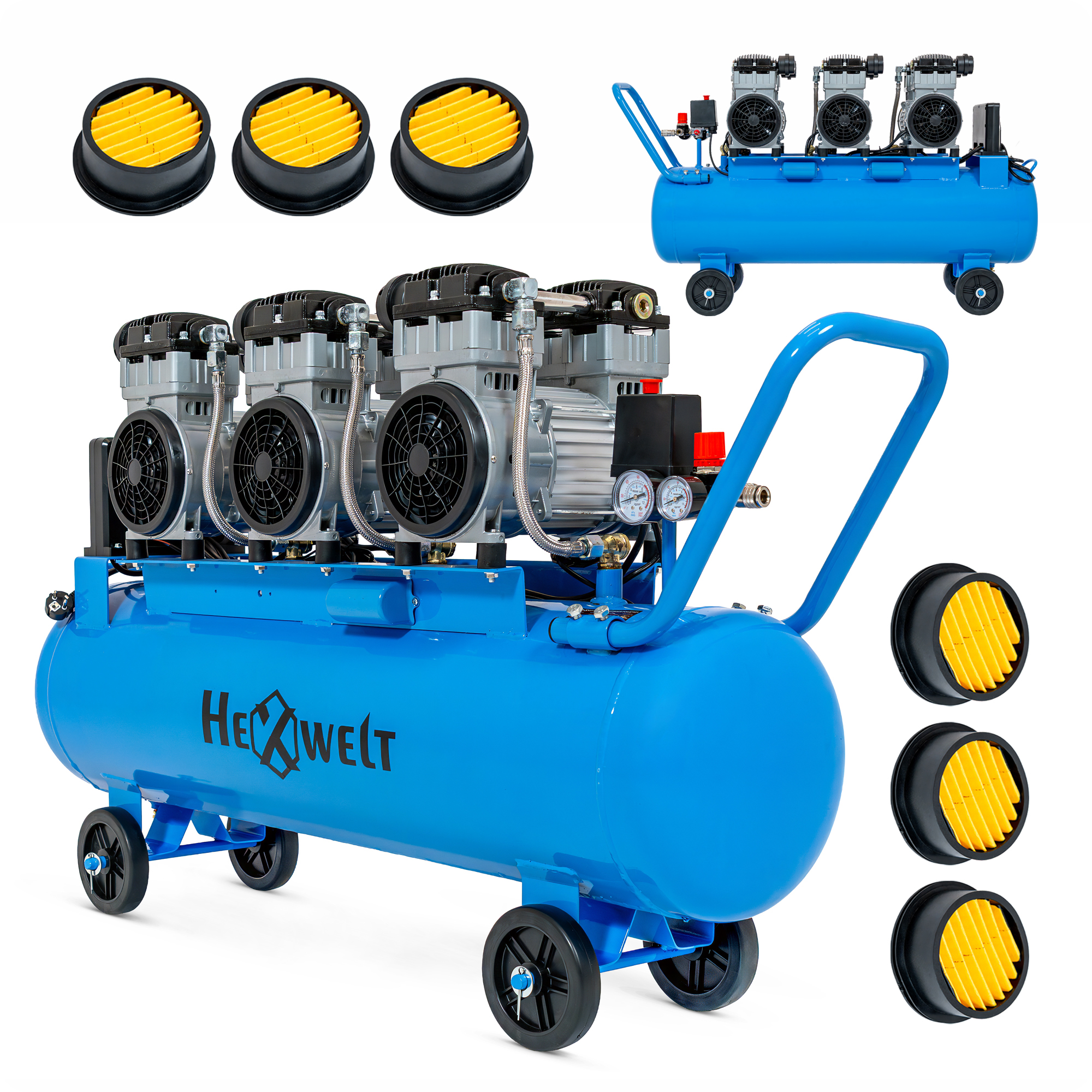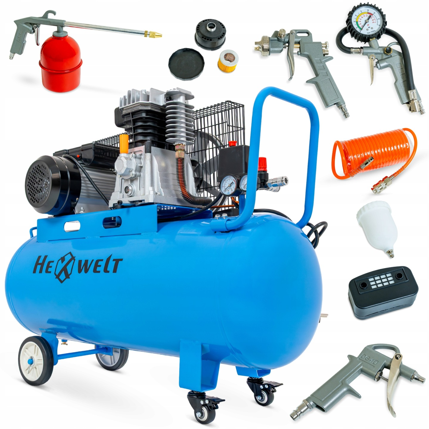 Kompresor olejowy 100L HEXWELT, wąż 5 m, pistolet do malowania, pistolet do przedmuchiwania, pistolet do pompowania, smarownica, filtr powietrza z obudową, instrukcja obsługi, koła stałe i obrotowe, elementy montażowe i zabezpieczenia do kół