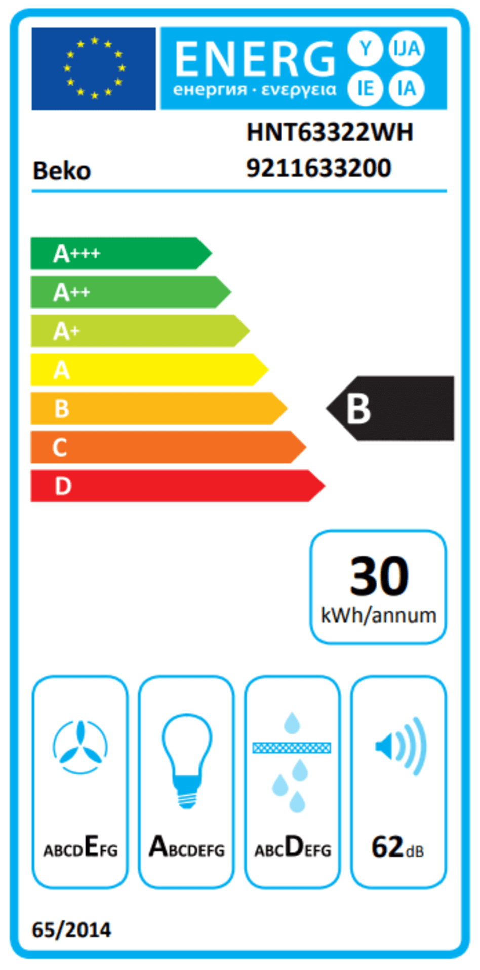 Model HNT63322WH pracuje z głośnością od 48 do 62 dB, dzięki czemu nie zakłóca codziennych rozmów ani pracy w kuchni. Klasa energetyczna B oraz roczne zużycie energii na poziomie 30 kWh sprawiają, że urządzenie jest ekonomiczne w użytkowaniu.