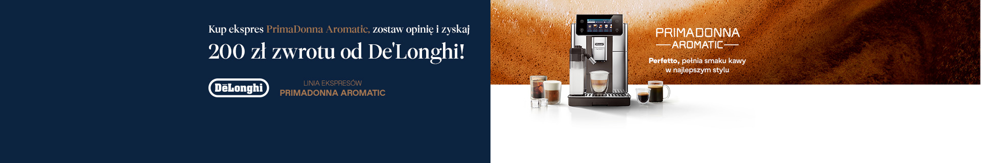 Ogromny wybór napojów w ekspresie De'Longhi PrimaDonna Aromatic umożliwia dopasowanie aromatycznych propozycji do każdego momentu dnia, nastroju czy potrzeby. Od intensywnego espresso, orzeźwiającego cold brew, po delikatniejsze kompozycje mleczne. Wybieraj spośród ponad 35 pozycji na zimno i ciepło, także z użyciem napojów roślinnych – dla wszystkich, którzy nie korzystają z tradycyjnego mleka – oraz ciesz sięfunkcją serwowania doskonałej herbaty!